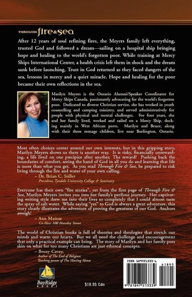 After 12 years of soul refining fires, the Meyers family left everything, trusted God and followed a dream-sailing on a hospital ship bringing hope and healing to the world's forgotten poor. While training at the Mercy Ships International Operations Center, a health crisis left them in shock and the dream sank before launching. Trust in God returned as they faced dangers of the sea, lessons in mercy and a quiet miracle. Hope and healing for the poor became their own reflections in the sea.