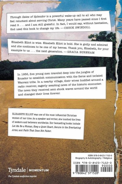 Through Gates of Splendor is the true story of five young missionaries who were savagely killed while trying to establish communication with the Auca Indians of Ecuador. The story is told through the eyes of Elisabeth Elliot, the wife of one of the young men who was killed.