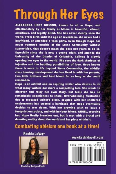 Through Her Eyes by Keshia LaVett ALEXANDRA HOPE NIELSON, known to all as Hope, and affectionately by her family as Moon, is beautiful, vibrant, ambitious, and legally blind. She has never clearly seen the world. From birth until seventeen, she never had a boyfriend or attended a teen party. Even though Hope has never ventured outside of the Stone Community without supervision, that doesn't mean she does not yearn to do so. Especially since she is now a young adult, and attends the University of the District of Columbia. College is slowly opening her eyes to the world. She sees the dark shadows of injustice and the budding possibilities of love. Hope knows there is more to life beyond Stone Community, the middle-class housing development she has lived in with her parents, two little brothers, and best friend for as long as she could remember. Hope is an activist and an aspiring writer who desires to do what many writers do; share a compelling tale. She wants to discover and relay her own story but feels she has no remarkable experiences to share. Overwhelming frustration due to repeated writer's block, coupled with her sheltered environment has created a barricade that Hope eventually decides to tear down. With her growing wish to leave a footprint on society, and with her best friend, ANGEL, coercing her, Hope finally branches out, but is met with a brutal and daunting reality about the world and her place within it. During the height of the Rodney King verdict controversy, Hope attends her first anti-racism rally without her parents' approval and is gravely injured. Instead of giving up and retreating back to her sheltered life, this frightening circumstance further propels Hope's craving to belong.
