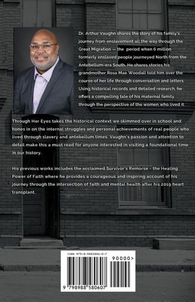 Dr. Arthur Vaughn shares the story of his family's journey from enslavement all the way through the Great Migration-the period when 6 million formerly-enslaved people journeyed North from the Antebellum-era South. He shares stories his grandmother Rosa Mae Woodall told him over the course of her life though conversation and letters. Using historical records and detailed research, he offers a compelling tale of his maternal family through the perspective of the women who lived it. The story begins with his earliest known ancestor, Katy Dawkins, who was born in 1802 in Virginia and later sold to a southern enslaver in South Carolina. Next, Grandma Rosa Mae Woodall shows us what life was like for a woman who looked after her siblings when her mother passed, lived through the Great Depression, and ran her own business in the 1950's. In great historical detail, Vaughn uncovers the harsh realities women experienced during plantation life as well as the realities of Jim Crow and the segregated North after the Civil War. Dr. Vaughn does a marvelous job accurately portraying the thoughts and emotions felt throughout this over 100-year family journey that set the foundation for generations to come. Through Her Eyes takes the historical context we skimmed over in school and homes in on the internal struggles and personal achievements of real people who lived through slavery and antebellum times. Vaughn's passion and attention to detail make this a must read for anyone interested in visiting a foundational time in our history.