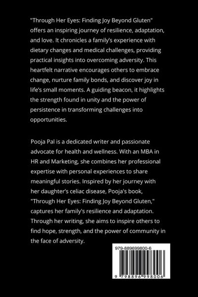 Through Her Eyes: Finding Joy Beyond Gluten In Through Her Eyes: Finding Joy Beyond Gluten, Pooja Pal takes readers on a heartfelt journey through the trials and triumphs of embracing a gluten-free lifestyle after a life-changing celiac disease diagnosis in her family. This inspiring memoir is more than just a personal account-it's a guiding light for anyone navigating similar challenges. From the shock of diagnosis to the everyday struggles of meal planning, dining out, and managing social expectations, Pooja shares how her family transformed obstacles into opportunities for growth, connection, and joy. With warmth and honesty, she delves into the emotional, physical, and social complexities of living gluten-free, offering practical tips, insightful reflections, and a message of hope. This book is a celebration of resilience, love, and the power of community. It shines a spotlight on the hidden challenges of celiac disease while empowering readers with tools to embrace life with positivity and purpose. Whether you're newly diagnosed, supporting a loved one, or simply curious about gluten-free living, Through Her Eyes provides invaluable insights and relatable stories that will uplift and inspire. With a mix of personal anecdotes, gluten-free tips, and an unwavering belief in the strength of the human spirit, Pooja Pal invites you to see life through her eyes-a lens of hope, determination, and newfound joy.