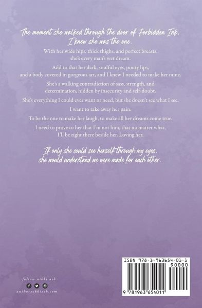 Lachlan The moment I saw her walk through the door of Forbidden Ink, I knew she was the one. With her wide hips, thick thighs, and perfect breasts, she's every man's wet dream. Add to that her dark, soulful eyes, pouty lips, and a body covered in gorgeous art, and I knew I needed to make her mine. She's a walking contradiction of sass and strength and determination, hidden by insecurity and self-doubt. She's everything I could ever want or need, but she doesn't see what I see. I want to take away her pain. To be the one to make her laugh, to make all her dreams come true. I need to prove to her that I'm not him, that no matter what, I'll be right there beside her. Loving her. If only she could see herself through my eyes, she would understand we were made for each other.