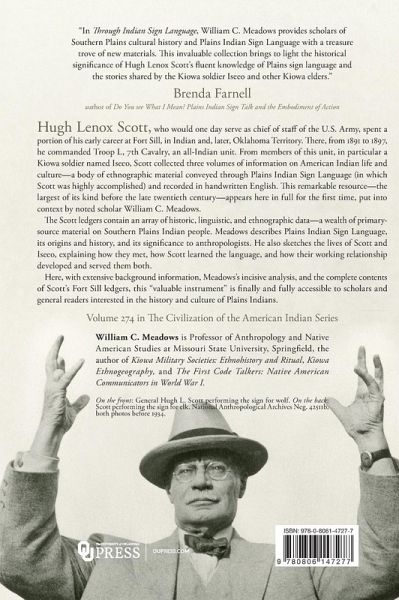 Hugh Lenox Scott, who would one day serve as chief of staff of the U.S. Army, spent a portion of his early career at Fort Sill, in Indian and, later, Oklahoma Territory. There, from 1891 to 1897, he commanded Troop L, 7th Cavalry, an all-Indian unit. From members of this unit, in particular a Kiowa soldier named Iseeo, Scott collected three volumes of information on American Indian life and culture-a body of ethnographic material conveyed through Plains Indian Sign Language (in which Scott was highly accomplished) and recorded in handwritten English. This remarkable resource-the largest of its kind before the late twentieth century-appears here in full for the first time, put into context by noted scholar William C. Meadows. The Scott ledgers contain an array of historical, linguistic, and ethnographic data-a wealth of primary-source material on Southern Plains Indian people. Meadows describes Plains Indian Sign Language, its origins and history, and its significance to anthropologists. He also sketches the lives of Scott and Iseeo, explaining how they met, how Scott learned the language, and how their working relationship developed and served them both. The ledgers, which follow, recount a variety of specific Plains Indian customs, from naming practices to eagle catching. Scott also recorded his informants' explanations of the signs, as well as a multitude of myths and stories. On his fellow officers' indifference to the sign language, Lieutenant Scott remarked: "I have often marveled at this apathy concerning such a valuable instrument, by which communication could be held with every tribe on the plains of the buffalo, using only one language." Here, with extensive background information, Meadows's incisive analysis, and the complete contents of Scott's Fort Sill ledgers, this "valuable instrument" is finally and fully accessible to scholars and general readers interested in the history and culture of Plains Indians.