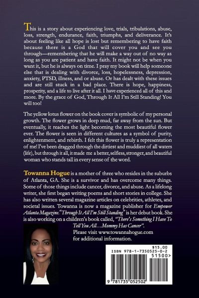 "Through It All I'm Still Standing" chronicles Towanna Hogue's life-changing journey of self-discovery, addressing the trials of being a cancer survivor, navigating narcissistic abuse, and juggling roles as a caregiver, wife, mother, daughter, and trailblazer. The narrative delves into the complexities of love, abuse, loss, endurance, faith, and triumphs. This memoir is not just a personal account but a powerful exploration of mental health awareness, shedding light on conditions like depression, PTSD, anxiety, and narcissistic personality disorder. Towanna bravely tackles various forms of abuse, emphasizing the significance of emotional, verbal, and financial abuse, often minimized but equally impactful. The narrative aims to resonate with those facing similar challenges, offering insights into marriage, divorce, cancer, and loss. Towanna's goal is to dismantle misconceptions surrounding mental health, eradicating stigma while encouraging individuals and families to confront the effects of these pervasive issues. "Through It All I'm Still Standing" is a beacon of hope, presented from the outset through its design featuring the yellow lotus flower. Symbolizing personal growth, the yellow lotus serves as an analogy for resilience - growing in deep mud, far from the sun, yet reaching the light to become a beautiful flower. The memoir's underlying message is clear: never let anyone diminish your worth; practice self-love, knowing that despite challenges, you, too, can stand tall. Towanna Hogue's candid narrative invites readers to confront their own struggles and find solace in the journey toward healing. Her hope is that this memoir provides a source of inspiration and encouragement for those facing seemingly insurmountable obstacles.