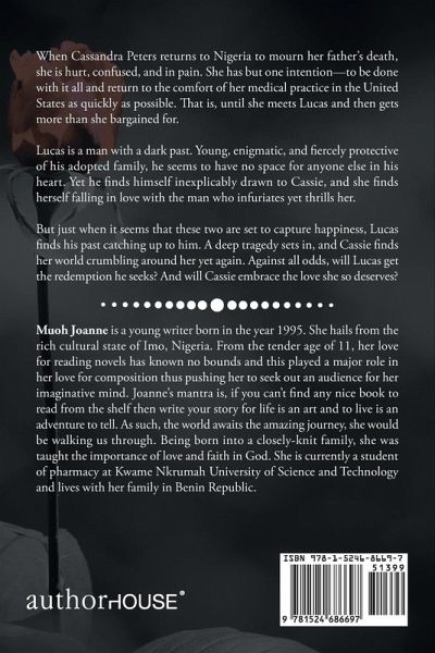 When Cassandra Peters returns to Nigeria to mourn her father's death, she is hurt, confused, and in pain. She has but one intention-to be done with it all and return to the comfort of her medical practice in the United States as quickly as possible. That is, until she meets Lucas and then gets more than she bargained for. Lucas is a man with a dark past. Young, enigmatic, and fiercely protective of his adopted family, he seems to have no space for anyone else in his heart. Yet he finds himself inexplicably drawn to Cassie, and she finds herself falling in love with the man who infuriates yet thrills her. But just when it seems that these two are set to capture happiness, Lucas finds his past catching up to him. A deep tragedy sets in, and Cassie finds her world crumbling around her yet again. Against all odds, will Lucas get the redemption he seeks? And will Cassie embrace the love she so deserves?