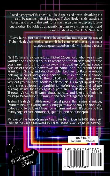 Neill Cullane is a closeted, conflicted 21-year-old who lives in two worlds: a San Francisco suburb where he's the middle-son of three young men, and, a short drive away in his beat-up VW bug, a seedy portion of the city's downtown. At home, he's the dutiful son of Frank and Grace, and devoted older brother to Peter - who is battling a cruel, disfiguring cancer - but in the city a chance encounter drags him into the orbit of Vince, a troubled, gregarious, very out gay transient. Moth to a flame, Neill is swept up and away by this secret lover, a beautiful junkie/philosopher/thief whose burning desire for truth lights a path Neill is destined to travel. Through Vince, Neill learns about honesty and love and finds the courage to confront his family in the face of tragedy and loss. Trebor Healey's multi-layered, lyrical prose illuminates a unique, intimate look at a young man's struggle to live openly and honestly, to love and to be loved, free from shame and guilt. It's a compelling family saga of rare emotional, spiritual, and poetic depth. Winner of the Ferro-Grumley Award for Best Novel in 2003, this new edition includes a foreword by Felice Picano (Like People in History). "I read passages of this novel out loud again and again, absorbing the truth beneath its lyrical language. Trebor Healey understands the beauty and cruelty that spill forth when men dare to express love to one another. He holds up a magnifying glass to the human heart, and his gaze is unblinking." - K. M. Soehnlein "Trebor Healey delivers coming out as apocalypse - tender, destructive, punk. He tore down a worn-out block of queer lit and built it back up. Sweet, sad, gritty, and real." - Michelle Tea "Love hurts, hurt heals - that's the crystalline message at the core of Trebor Healey's complex, accomplished coming-of-age story about a cautiously queer suburban kid whose heart is unexpectedly squeezed hard by a young junkie's quicksilver mind and beautiful lean body. Neill's life-affirming attraction to life-weary Vince is doomed from this wise novel's very first line - but their fumbling struggle for physical love, emotional connection, and mutual maturity is mesmerizing. The searing implosion of their passion is no surprise, but it shimmers with the compelling honesty of real lives, while Healey's refreshingly original tale hums with the potency of poetry." - Richard Labonté