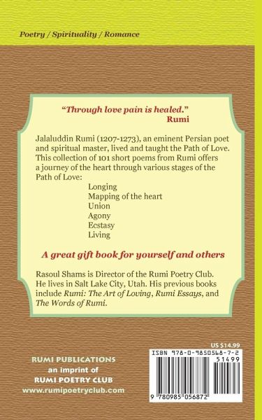 Jalaluddin Rumi (1207-1273), an eminent Persian Sufi poet, lived and taught the path of love. This is a collection of 101 short poems by Rumi centered on the heart and various stages of love: Longing, mapping of the heart, union, agony, ecstasy, and living. A new translation from the Persian. A great gift book for yourself and others. Through Love Pain Is Healed: 101 Poems of the Heart by Rumi, Jalaluddin Rumi, translated by Rasoul Shams, Published by Rumi Publications, Rumi Poetry Club, Salt Lake City, Utah, 2023, Paperback, 144 pages, US $14.99. About the Translator: Rasoul Shams first learned of Rumi's poems in his Persian classes as a young boy in Iran. The works of Rumi and other Persian poets have been his spiritual companions for decades. He has studied and lived in India, Japan, and the USA. He founded the Rumi Poetry Club in 2007. His previous books include Rumi: The Art of Loving (2012), Rumi Essays: On the Life, Poetry, and Vision of the Greatest Persian Sufi Poet (2016), and The Words of Rumi (2017).