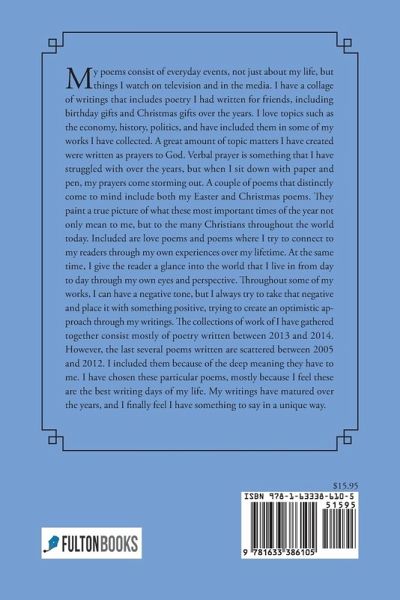 My poems consist of everyday events, not just about my life, but things I watch on television and in the media. I have a collage of writings that includes poetry I had written for friends, including birthday gifts and Christmas gifts over the years. I love topics such as the economy, history, politics, and have included them in some of my works I have collected. A great amount of topic matters I have created were written as prayers to God. Verbal prayer is something that I have struggled with over the years, but when I sit down with paper and pen, my prayers come storming out. A couple of poems that distinctly come to mind include both my Easter and Christmas poems. They paint a true picture of what these most important times of the year not only mean to me, but to the many Christians throughout the world today. Included are love poems and poems where I try to connect to my readers through my own experiences over my lifetime. At the same time, I give the reader a glance into the world that I live in from day to day through my own eyes and perspective. Throughout some of my works, I can have a negative tone, but I always try to take that negative and place it with something positive, trying to create an optimistic approach through my writings. The collections of work of I have gathered together consist mostly of poetry written between 2013 and 2014. However, the last several poems written are scattered between 2005 and 2012. I included them because of the deep meaning they have to me. I have chosen these particular poems, mostly because I feel these are the best writing days of my life. My writings have matured over the years, and I finally feel I have something to say in a unique way.