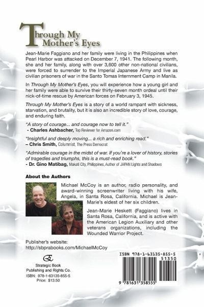 Jean-Marie Faggiano and her family were living in the Philippines when Pearl Harbor was attacked on December 7, 1941. The following month, she and her family, along with over 3,600 other non-national civilians, were forced to surrender to the Imperial Japanese Army and live as civilian prisoners of war in the Santo Tomas Internment Camp in Manila.In Through My Mother's Eyes, you will experience how a young girl and her family were able to survive their thirty-seven month ordeal until their nick-of-time rescue by American forces on February 3, 1945.Through My Mother's Eyes is a story of a world rampant with sickness, starvation, and brutality, but it is also an incredible story of love, courage, and enduring faith."A story of courage... and courage now to tell it." - Charles Ashbacher, Top Reviewer for Amazon.com"Insightful and deeply moving... a rich and enriching read." - Chris Smith, Columnist, The Press Democrat"Admirable courage in the midst of war. If you're a lover of history, stories of tragedies and triumphs, this is a must-read book." - Dr. Gino Matibag, Makati City, Philippines, Author of JAPAN Lights and Shadows(About the Authors)Michael 'Doc' McCoy was born in San Rafael, California, on October 9, 1955. He lived in Marin County until his family moved to Sonoma Valley in 1963. After graduating from high school in Sonoma in 1973, Michael attended Santa Rosa Junior College and California Polytechnic State University in San Luis Obispo. Following college, Michael enlisted in the U.S. Navy and served aboard the aircraft carrier U.S.S. Independence (CV-62) from 1979 through 1982. In 2007, Michael began writing the biography of his mother and her family's experience in a Japanese prison camp during WWII and completed the manuscript after his trip to the Philippines in 2008. His highly praised book, Through My Mother's Eyes, was published by Strategic Book Publishing and Rights Agency in September of 2008. Michael wrote the award-winning screenplay adaptation, Under the Rising Sun, the following year. Besides creative writing and radio, Michael is also a technical writer at Keysight Technologies in Santa Rosa, California. He is married to Angela McCoy and has a son, Thomas, who lives in North Las Vegas with his family.