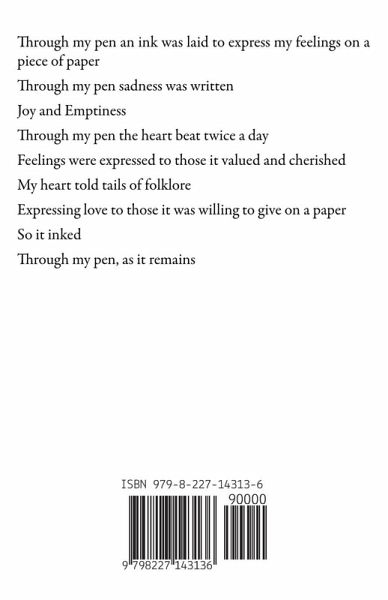 Through my pen an ink was laid to express my feelings on a piece of paper Through my pen sadness was written Joy and Emptiness Through my pen the heart beat twice a day Feelings were expressed to those it valued and cherished My heart told tails of folklore Expressing love to those it was willing to give on a paper So it inked Through my pen, as it remains