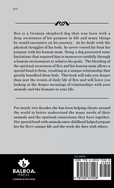 Rex is a German shepherd dog that was born with a deep awareness of his purpose in life and many things he would encounter on his journey. As he dealt with the physical struggles of his body, he never veered far from his purpose with his human mom. Being a dog presented some limitations that required him to maneuver carefully through a human environment to achieve his goals. The blending of the spiritual awareness of Rex and his human mom allows a special bond to form, resulting in a unique relationship that greatly benefited them both. This book will take you deeper than just the events of daily life of Rex and will leave you looking at the deeper meanings of relationships with your animals and the humans in your life.