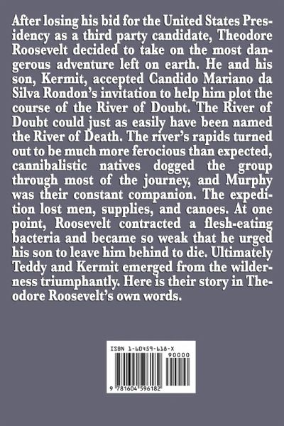 After losing his bid for the United States Presidency as a third party candidate, Theodore Roosevelt decided to take on the most dangerous adventure left on earth. He and his son, Kermit, accepted Candido Mariano da Silva Rondon's invitation to help him plot the course of the River of Doubt. The River of Doubt could just as easily have been named the River of Death. The river's rapids turned out to be much more ferocious than expected, cannibalistic natives dogged the group through most of the journey, and Murphy was their constant companion. The expedition lost men, supplies, and canoes. At one point, Roosevelt contracted a flesh-eating bacteria and became so weak that he urged his son to leave him behind to die. Ultimately Teddy and Kermit emerged from the wilderness triumphantly. Here is their story in Theodore Roosevelt's own words.