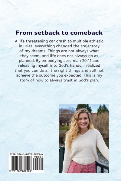 From setback to comeback: A life threatening car crash to multiple athletic injuries, everything changed the trajectory of my dreams. Things are not always what they seem, and life does not always go as planned. By embodying Jeremiah 29:11 and releasing myself into God’s hands, I realized that you can do all the right things and still not achieve the outcome you expected. This is my story of how to always trust in God’s plan.