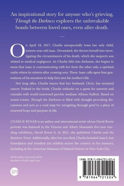 2025 National Indie Excellence Award Winner, Death & Dying category. An inspirational story for anyone who's grieving, Through the Darkness explores the unbreakable bonds between loved ones, even after death. On April 18, 2017, Charlie unexpectedly loses her only child, sixteen-year-old Isaac. Devastated, she throws herself into investigating the circumstances of his death, which she suspects was related to medical negligence. As Charlie falls into darkness, she begins to sense that Isaac is communicating with her from the other side, a spiritual realm where he returns after crossing over. There, Isaac calls upon four generations of his ancestors to help him save his mother's life. Not long after, Charlie learns that her husband, Chris, has terminal cancer. Pushed to the brink, Charlie embarks on a quest for answers and consults with world-renowned psychic medium Allison DuBois. Based on actual events, Through the Darkness is filled with thought-provoking discussions and acts as a road map for navigating through grief to a place of renewed hope and purpose in life.