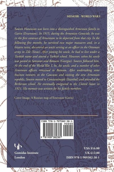 Souren Hanessian was born into a distinguished Armenian family in Garin (Erzeroum). In 1915, during the Armenian Genocide, he was in the first caravan of Armenians to be deported from that city. In the following few months, he survived two major massacres and, in a bizarre twist, discovered an uncle serving as an officer in the Ottoman army in Zile (Sivas). After joining his uncle, he had to live under a Turkish name and attend a Turkish school. However, when his uncle was posted to Samsoun and Batoum (Georgia), Souren followed him. At the end of the World War I, he, his uncle, and a number of other Armenian officers remained in Batoum. After undertaking some business ventures in the Caucasus and visiting the new Armenian republic, Souren moved to Constantinople (Istanbul) and attended the Berberian school. He eventually emigrated to the United States in 1921. His memoir was written for his family members.