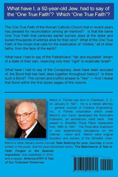 Here I, a 92-year-old Jew, tell of One True Faith - of the "morally infallible" One True Faith of The Roman Catholic Church which in recent years has pleaded for reconciliation among all mankind but in earlier years burned Jews at the stake and buried thousands of witches alive for their sins. I tell, too, of another One True Faith, risen upon the scene, this of Islam, calling for the eradication from the face of the earth of "infidels," all of other faiths, including Judaism and Christianity. Is Israel reluctant to permit the Palestinians to have a state of their own? Why? Can it be because the Palestinians wish to reserve to their state the right to eradicate Israel? Is it true that there is a Conspiracy among Jews, a Bond, that has held them together throughout history? Yes, it is true! I confess and reveal that Bond within the first dozen pages of this volume.