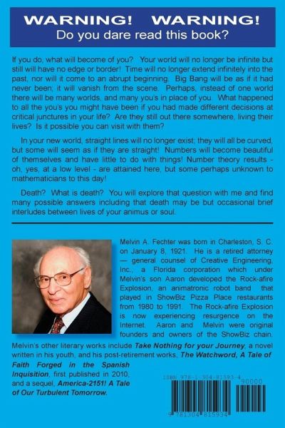 Time will no longer extend infinitely into the past, nor will it come to an abrupt beginning. Big Bang will be as if it had never been; it will vanish from the scene. Perhaps, instead of one world there will be many worlds, and many you's in place of you. What happened to all the you's you might have been if you had made different decisions at critical junctures in your life? Are they still out there somewhere, living their lives? Is it possible you can visit with them? In your new world, straight lines will no longer exist; they will all be curved, but some will seem as if they are straight! Numbers will become beautiful of themselves and have little to do with things! Number theory results - oh, yes, at a low level - are attained here, but some perhaps unknown to mathematicians to this day! Death? What is death? You will explore that question with me and find many possible answers including that death may be but occasional brief interludes between lives of your animus or soul.