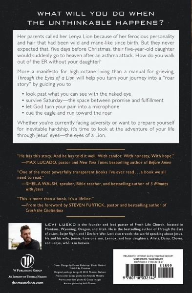 Levi Lusko is the founder and lead pastor of Fresh Life Church located in Montana, Idaho, Oregon, and Utah. He is the bestselling author of Through the Eyes of a Lion, Swipe Right, I Declare War, The Last Supper on the Moon , and Roar Like a Lion, the 2022 ECPA Christian Book Award winner for young people's literature. Levi also travels the world speaking about Jesus. He and his wife, Jennie, have one son, Lennox, and four daughters: Alivia, Daisy, Clover, and Lenya, who is in heaven.