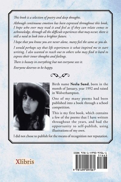 Birth name Neelu Sund, born in the month of January, year 1992 and raised in Wolverhampton. One of my many poems had been published into a book through a school competition. This is my first book, which contains a few of the poems that I have written throughout the years, and had the opportunity to self-publish, using illustrations of my own. I did not chose to publish for the means of recognition nor reputation.