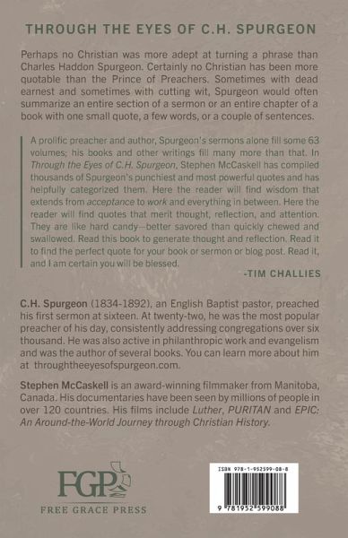 Perhaps no Christian was more adept at turning a phrase than Charles Haddon Spurgeon. Certainly no Christian has been more quotable than the Prince of Preachers. Sometimes with dead earnest and sometimes with cutting wit, Spurgeon would often summarize an entire section of a sermon or an entire chapter of a book with one small quote, a few words, or a couple of sentences. Through the Eyes of Spurgeon is a goldmine of memorable statements of C. H. Spurgeon mined out of his books and 3,600 sermons. The Prince of Preachers had a gift of concisely and powerfully communicating the truths of the gospel. And this book gathers thousands of the most meaningful quotes of Spurgeon into one accessible volume.