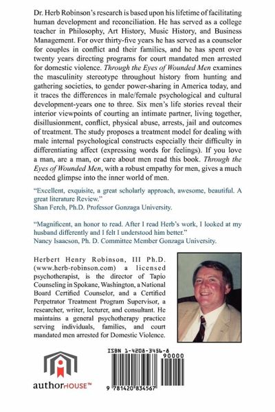 Based on Dr. Herb Robinson's lifetime of facilitating human development and reconciliation for over thirty-five years served as a counselor for couples in conflict and their families; a college teacher in Philosophy, Art History, and Music History; has over twenty years directing programs for court mandated men arrested for domestic violence, Through the Eyes of Wounded Men examines the masculinity stereotype throughout history from hunting and gathering societies, to potential gender power-sharing in America. It traces the differences in male/female psychological and social development-years one to three. Six men's life stories reveal their interior viewpoints of courting an intimate partner, living together, conflict, physical abuse, arrests, jail and outcomes of treatment. The study proposes a treatment model for dealing with male internal psychological constructs regarding their difficulty in differentiating affect.