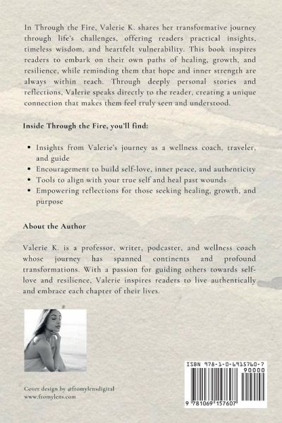 "Through the Fire" is a powerful journey of healing, growth, and resilience, offering readers a beacon of hope and inner strength. Valerie's in-depth personal stories and reflections resonate with readers, creating a unique connection that leaves them feeling truly seen and understood. Her voice serves as a guide, encouraging each reader to find their own path through life's challenges and embrace the resilience within. This book is a testament to the power of vulnerability and the transformative journey to inner peace and self-empowerment. Inside Through the Fire, you'll find: - Insights from Valerie's journey as a wellness coach, traveler, and guide - Encouragement to build self-love, inner peace, and authenticity - Tools to align with your true self and heal past wounds - Empowering reflections for those seeking healing, growth, and purpose About the Author Valerie K. is a professor, writer, podcaster, wellness coach, and entrepreneur whose journey has spanned continents and profound transformations. Host of the From My Lens wellness podcast and founder of a successful coaching practice, Valerie has worked with hundreds of clients, guiding them towards self-love, resilience, and healing. Her life's mission is to inspire others to live authentically, embrace vulnerability, and find strength in each chapter of their lives. With a passion for sharing both her own experiences and the wisdom she's gathered from diverse cultures, Valerie's work reflects a heartfelt commitment to helping others unlock their fullest potential and live with purpose. What Inspired Me to Write This Book Through the Fire was born from my desire to share a message of hope, healing, and resilience with anyone navigating life's struggles. Over the years, working with clients, traveling, and sharing stories on my From My Lens podcast, I saw a universal thread: the strength people find within themselves, even in the face of life's greatest challenges. I realized that our toughest experiences are often the ones that shape us most profoundly, offering lessons in vulnerability, courage, and self-acceptance. I wrote this book to be a companion to those who feel weighed down, lost, or in search of a deeper sense of self-worth. It's my invitation for you to embrace your own journey, find beauty in each chapter, and remember that even in the darkest moments, there is a path forward.
