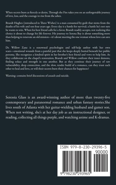 When secrets burn as fiercely as desire, Through the Fire takes you on an unforgettable journey of love, loss, and the courage to rise from the ashes. Brandt Hughes (introduced in Three Wishes) is a man consumed by guilt that stems from the deaths of his wife and son four years ago. Every day is a battle for survival; a battle he's not sure he wants to win. When his best friend calls for a favor, Brandt readily accepts, not realizing this choice is about to change his life forever. His journey to Serena Bay is about something more than helping to renovate an old mission-it's about meeting the one woman whose love can save him. Dr. Willow Zane is a renowned psychologist and self-help author with her own scars-emotional wounds from a painful past that she keeps deeply buried beneath her public persona. She recognizes a kindred spirit in her brother's best friend and vows to help him. As they collaborate on the chapel's restoration, Brandt and Willow confront their inner demons, finding solace and strength in one another. But as they continue their journey of raw vulnerability, deep connection, and the slow, tender build of a romance, can they trust each other to heal and love, or will their secrets burn their chances for happiness? Warning: contains brief discussions of assault and suicide.