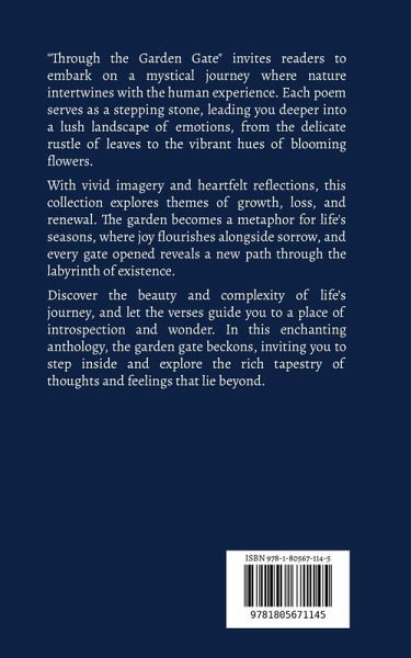 "Through the Garden Gate" invites readers to embark on a mystical journey where nature intertwines with the human experience. Each poem serves as a stepping stone, leading you deeper into a lush landscape of emotions, from the delicate rustle of leaves to the vibrant hues of blooming flowers. With vivid imagery and heartfelt reflections, this collection explores themes of growth, loss, and renewal. The garden becomes a metaphor for life's seasons, where joy flourishes alongside sorrow, and every gate opened reveals a new path through the labyrinth of existence. Discover the beauty and complexity of life's journey, and let the verses guide you to a place of introspection and wonder. In this enchanting anthology, the garden gate beckons, inviting you to step inside and explore the rich tapestry of thoughts and feelings that lie beyond.