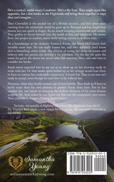 He's a cynical, world-weary Londoner. She's a shy Scot. They might seem like opposites, but a few weeks in the Highlands will bring them together in ways they can't imagine... Theo Cavendish is the second son of a British viscount, and he's spent years running from the aristocratic world he grew up in. Betrayal and loss taught him lessons he's not quick to forget. As an award-winning screenwriter and creator, Theo prefers to throw himself into the world of film and television. He moves from one project to another, never really letting anyone truly know him. As a housekeeper at the exclusive Ardnoch Estate, shy Sarah McCulloch feels invisible most days. No one really knows her, and they definitely don't know she's a bestselling crime writer. She dreams of seeing her series on screen and believes only one person can develop it for television. On the day she quits the estate for good, she shares her secret with club member, Theo, and asks him to consider her books. Sarah never expected him to say yes or to show up on her doorstep ready to write with her. Or that weeks spent locked up in her cottage would lead them to form an intense but undeniable connection. A bond that Theo is not sure he's ready to accept, even though he can't bear to be without her. However, when they finally venture out of their bubble, Theo finds he'll have to battle more than his own demons to protect Sarah from hurt. For he has another fan, one intent on bringing the darkest elements of his most famous script to life. And unless he can figure out this real-life antagonist's next move, Theo could be in danger of losing Sarah forever.