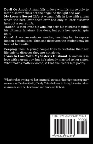 Devil Or Angel: John Winston wakes in a hospital bed following an auto accident to find a pretty nurse taking care of him. They hit it off and begin to date. As time goes on, though, he discovers the woman is not the angel he thought she was. Instead, she is known in the trade as Lady Diana, a dominatrix. She coaxes John slowly into her world of bondage, which he finds as addictive as it is exciting—until he stumbles upon the truth that Lady Diana is operating more than one business on the side. My Lover's Secret Life: Jasmine falls in love with a handsome man who's the best lover she's ever been with only to later discover he's got a secret life she can't accept. Touché: Though Jeremy loves his wife, he finds that his mistress fills his need for impulsive excitement that his wife cannot. When Jeremy's mistress puts his ultimate fantasy into motion, participating in a ménage a trios, she puts her special spin on it, and totally rocks his world. Oops!: Sara accepts a ride with Deidre, only to find herself being seduced. With her introduction to scintillating sexual horizons reaching a feverish pitch, Sara succumbs to the fervor of unexplored pleasures. Now that Sara has redefined her sexuality, will she be too hot for Deidre to handle? Peeping Tom: A young couple tries to revitalize their sex life which has fallen into the doldrums only to discover they are not alone. I Was In Love With My Sister's Husband: Rochelle Robinson loves Wayne Watson. However, he is the one man she could never have, because he's already married to her younger sister, Amber. What makes matters worse, Amber treats Wayne like dirt and cares even less for their son, Ty. What will Rochelle do when she discovers her sister's been unfaithful? Have you ever desired to be a fly on the wall, itching to know what was going on in some room? This anthology will bring out the voyeur in you. Devil Or Angel: John Winston wakes in a hospital bed following an auto accident to find a pretty nurse taking care of him. They hit it off and begin to date. As time goes on, though, he discovers the woman is not the angel he thought she was. Instead, she is known in the trade as Lady Diana, a dominatrix. She coaxes John slowly into her world of bondage, which he finds as addictive as it is exciting—until he stumbles upon the truth that Lady Diana is operating more than one business on the side. My Lover's Secret Life: Jasmine falls in love with a handsome man who's the best lover she's ever been with only to later discover he's got a secret life she can't accept. Touché: Though Jeremy loves his wife, he finds that his mistress fills his need for impulsive excitement that his wife cannot. When Jeremy's mistress puts his ultimate fantasy into motion, participating in a ménage a trios, she puts her special spin on it, and totally rocks his world. Oops!: Sara accepts a ride with Deidre, only to find herself being seduced. With her introduction to scintillating sexual horizons reaching a feverish pitch, Sara succumbs to the fervor of unexplored pleasures. Now that Sara has redefined her sexuality, will she be too hot for Deidre to handle? Peeping Tom: A young couple tries to revitalize their sex life which has fallen into the doldrums only to discover they are not alone. I Was In Love With My Sister's Husband: Rochelle Robinson loves Wayne Watson. However, he is the one man she could never have, because he's already married to her younger sister, Amber. What makes matters worse, Amber treats Wayne like dirt and cares even less for their son, Ty. What will Rochelle do when she discovers her sister's been unfaithful?