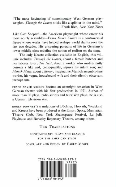 Like Sam Shepard—the American playwright whose career his most nearly resembles—Franz Xaver Kroetz is a controversial figure whose works have helped reshape world drama over the last two decades. His unsparing portraits of life in Germany's lower middle class redefine the notion of realism on the stage. The only Kroetz collection available in English, this volume includes: Through the Leaves, about a female butcher and her laborer lover; The Nest , about a worker who inadvertently poisons a lake and, consequently, injures his infant son; and Mensch Meier, about a jittery, imaginative Munich assembly-line worker, his vague, housebound wife and their silently observant teenage son.