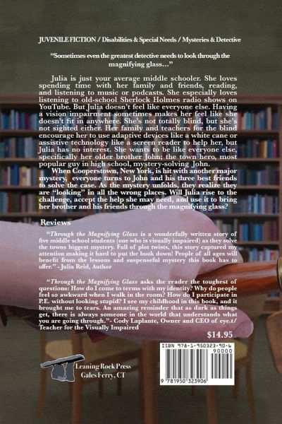 "Sometimes even the greatest detective needs to look through the magnifying glass..." Julia is just your average middle schooler. She loves spending time with her family and friends, reading, and listening to music or podcasts. She especially loves listening to old-school Sherlock Holmes radio shows on YouTube. But Julia doesn't feel like everyone else. Having a vision impairment sometimes makes her feel like she doesn't fit in anywhere. She's not totally blind, but she's not sighted either. Her family and teachers for the blind encourage her to use adaptive devices, like a white cane, or assistive technology, like a screen reader, to help her, but Julia has no interest. She wants to be just like everyone else, specifically her older brother, John, the town hero, most popular guy in high school, mystery-solving,John. When Cooperstown, New York is hit with another major mystery, everyone turns to John and his three best friends to solve the case. As the mystery unfolds, they realize they are "looking" in all the wrong places. Will Julia rise to the challenge, accept the help she may need, and use it to bring her brother and his friends through the magnifying glass?