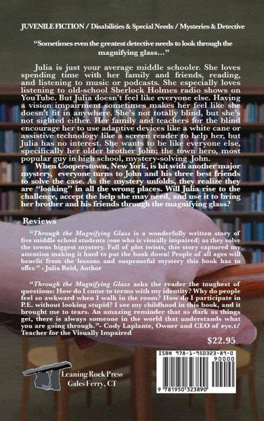 A Red ribbon award winner from the Wishing Shelf Award. "Sometimes even the greatest detective needs to look through the magnifying glass..." Julia is just your average middle schooler. She loves spending time with her family and friends, reading, and listening to music or podcasts. She especially loves listening to old-school Sherlock Holmes radio shows on YouTube. But Julia doesn't feel like everyone else. Having a vision impairment sometimes makes her feel like she doesn't fit in anywhere. She's not totally blind, but she's not sighted either. Her family and teachers for the blind encourage her to use adaptive devices, like a white cane, or assistive technology, like a screen reader, to help her, but Julia has no interest. She wants to be just like everyone else, specifically her older brother, John, the town hero, most popular guy in high school, mystery-solving,John. When Cooperstown, New York is hit with another major mystery, everyone turns to John and his three best friends to solve the case. As the mystery unfolds, they realize they are "looking" in all the wrong places. Will Julia rise to the challenge, accept the help she may need, and use it to bring her brother and his friends through the magnifying glass?