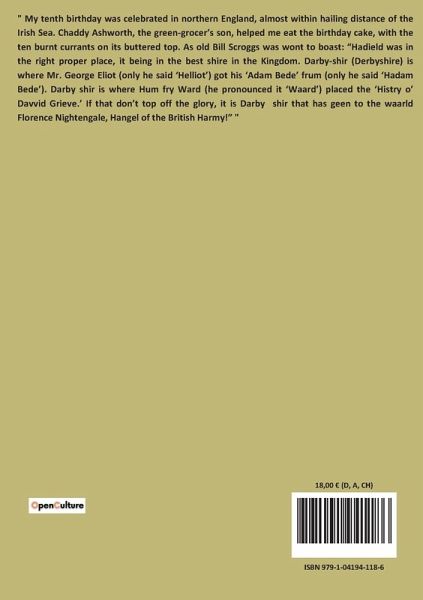 " My tenth birthday was celebrated in northern England, almost within hailing distance of the Irish Sea. Chaddy Ashworth, the green-grocer¿s son, helped me eat the birthday cake, with the ten burnt currants on its buttered top. As old Bill Scroggs was wont to boast: ¿Hadield was in the right proper place, it being in the best shire in the Kingdom. Darby-shir (Derbyshire) is where Mr. George Eliot (only he said ¿Helliot¿) got his ¿Adam Bede¿ frum (only he said ¿Hadam Bede¿). Darby shir is where Hum fry Ward (he pronounced it ¿Waard¿) placed the ¿Histry ö Davvid Grieve.¿ If that don¿t top off the glory, it is Darby shir that has geen to the waarld Florence Nightengale, Hangel of the British Harmy!¿ "
