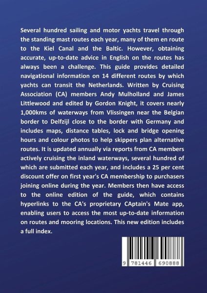 The Staande Mast Route (Dutch for Standing Mast Route) enables yachts with their masts up to transit nearly 1,000 kms of inland waterways in the Netherlands leading from Vlissingen close to the Belgian border as far as Delfzijl near the border with Germany. Although often described as a single route, parts of it can in fact be transited via several alternative routes. Authorities responsible for the various sections of the Staande Mast Route co-ordinate bridge and lock opening times to provide smooth passage for users, which include numerous commercial vessels as well as leisure craft - or 'sport boats' as they are known in the Netherlands. Several hundred yachts (both sail and motor) use the Route each year as an alternative to braving the exposed west and north coasts of the Netherlands, where ports of refuge are not plentiful. This guide to the Route is produced and edited by the European Inland Waterways Section (EIWS) of the Cruising Association (CA) and relies on regular updates from its members, many of whom cruise all or parts of the Route each year. It also includes a 25 per cent discount offer on first year's CA membership to purchasers joining online during the year. Members have access to the CA's proprietary CAptain's Mate app, enabling them to access the most up-to-date information on routes and moorings locations. It also includes a special code providing a 25% discount on a PDF version of the guide from the CA's Shopify online store at https://cruising-association-eiws.myshopify.com throughout 2024.