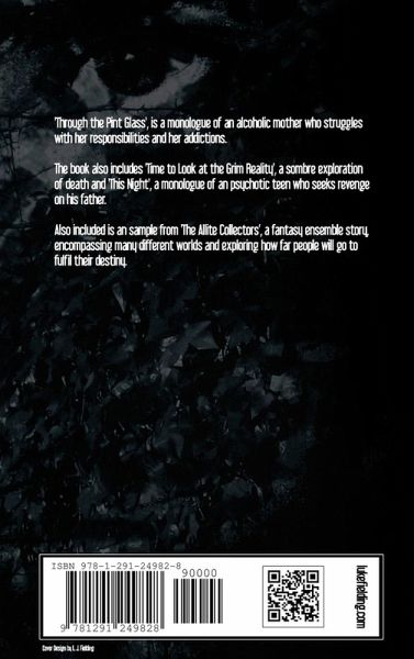 'Through the Pint Glass', is a monologue of an alcoholic mother who struggles with her responsibilities and her addictions. The book also includes 'Time to Look at the Grim Reality', a sombre exploration of death and 'This Night', a monologue of an psychotic teen who seeks revenge on his father. Also included is an sample from 'The Allite Collectors', a fantasy ensemble story, encompassing many different worlds and exploring how far people will go to fulfill their destiny.