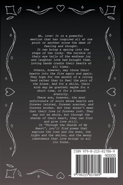 Ah, love! A powerful emotion. It can bring a spring into the steps of the lucky. The twinkle in their eye tells of the endless joy and laughter love had brought them. Loving hands cradle their hearts at all times. Others, however, may throw their hearts into the fire again and again. They hope for the warmth of a loving hand rather than to feel the pain of the blaze. And for a while, their wish may be granted; maybe for a short time, or for a blessed eternity. There are, however, the most unfortunate of souls whose hearts are forever twisted, forever scarred, and forever broken. But that doesn't mean that their love is forever lost. They may not be whole, but through the shards of their heart, they can find and give love still. In "Through the Shards of My Heart", you'll find poems that explore the lows and the woes, the highs and the smiles, and the messy inbetweens that love brings in all its forms.