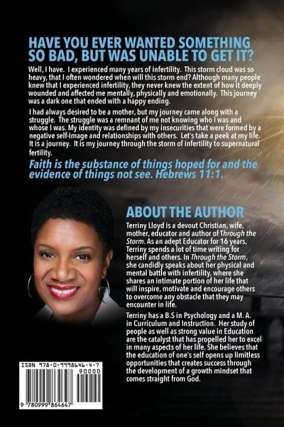 Through the Storm is a book that focuses on the emotional roller coasters that many face during their storm of infertility. It sheds light on how society perpetuates pregnancy, and invisibly shuns infertility. The journey of infertility can wreak havoc, but once it is conquered, it can create a life of joy and fulfillment. So, take a walk with me as I share this intimate portion of my life that will inspire, motivate and encourage you to overcome any obstacle that you may encounter in life.