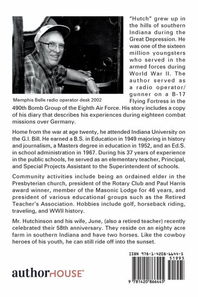 "Hutch" grew up in the hills of southern Indiana during the Great Depression. He was one of the sixteen million youngsters who served in the armed forces during World War II. The author served as a radio operator/gunner on a B-17 Flying Fortress in the 490th Bomb Group of the Eighth Air Force. His story includes a copy of of his diary that describe his experiences during eighteen combat missions over Germany. Home from the war at age twenty, he attended Indiana University on the G.I. Bill. He earned a B.S. in Education in 1949 majoring in history and journalism, a Masters degree in education in 1952, and an Ed.S. in school administration in 1967. During his 37 years of experience in the public schools, he served as an elementary teacher, Principal, and Special Projects Assistant to the Superintendent of schools. Community activities include being an ordained elder in the Presbyterian church, president of the Rotary Club and Paul Harris award winner, member of the Masonic Lodge for 46 years, and president of various educational groups such as the Retired Teacher's Association. Hobbies include golf, horseback riding, traveling, and WWII history. Mr. Hutchinson and his wife, June, (also a retired teacher) recently celebrated their 58th anniversary. They reside on an eighty acre farm in southern Indiana and have two horses. Like the cowboy heroes of his youth, he can still ride off into the sunset.