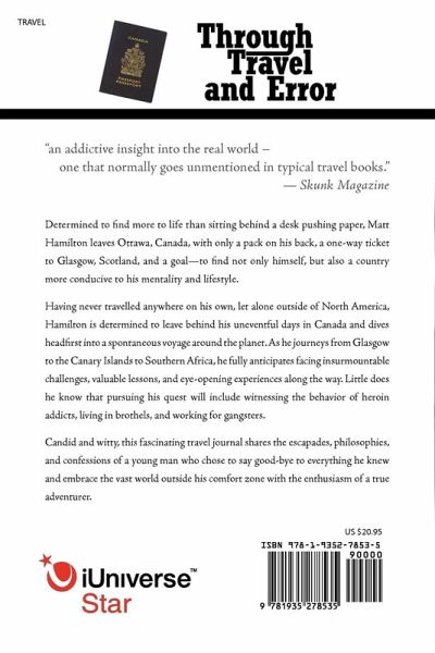 Determined to find more to life than sitting behind a desk pushing paper, Matt Hamilton leaves Ottawa, Canada, with only a pack on his back, a one-way ticket to Glasgow, Scotland, and a goal-to find not only himself, but also a country more conducive to his mentality and lifestyle. Having never travelled anywhere on his own, let alone outside of North America, Hamilton is determined to leave behind his uneventful days in Canada and dives headfirst into a spontaneous voyage around the planet. As he journeys from Glasgow to Ireland to the Netherlands, he fully anticipates facing insurmountable challenges, valuable lessons, and eye-opening experiences along the way. Little does he know that pursuing his quest will include witnessing the behavior of heroin addicts, living in brothels, and working for gangsters. Candid and witty, this fascinating travel journal shares the escapades, philosophies, and confessions of a young man who chose to say good-bye to everything he knew and embrace the vast world outside his comfort zone with the enthusiasm of a true adventurer.