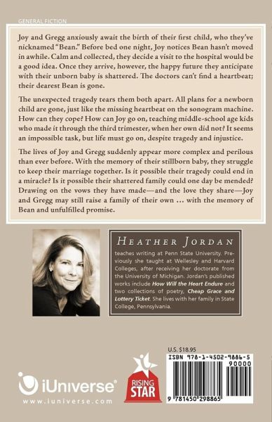 Joy and Gregg anxiously await the birth of their first child, who they've nicknamed "Bean." Before bed one night, Joy notices Bean hasn't moved in awhile. Calm and collected, they decide a visit to the hospital would be a good idea. Once they arrive, however, the happy future they anticipate with their unborn baby is shattered. The doctors can't find a heartbeat; their dearest Bean is gone. The unexpected tragedy tears them both apart. All plans for a newborn child are gone, just like the missing heartbeat on the sonogram machine. How can they cope? How can Joy go on, teaching middle- school age kids who made it through the third trimester, when her own did not? It seems an impossible task, but life must go on, despite tragedy and injustice. The lives of Joy and Gregg suddenly appear more complex and perilous than ever before. With the memory of their stillborn baby, they struggle to keep their marriage together. Is it possible their tragedy could end in a miracle? Is it possible their shattered family could one day be mended? Drawing on the vows they have made-and the love they share-Joy and Gregg may still raise a family of their own ... with the memory of Bean and unfulfilled promise.