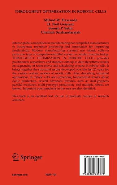 Intense global competition in manufacturing has compelled manufacturers to incorporate repetitive processing and automation for improving productivity. Modern manufacturing systems use robotic cells - a particular type of computer-controlled system in cellular manufacturing. Throughput optimization in robotic cells provides practitioners, researchers, and students with up-to-date algorithmic results on sequencing of robot moves and scheduling of parts in robotic cells. It brings together the structural results developed over the last 25 years for the various realistic models of robotic cells. After describing industrial applications of robotic cells and presenting fundamental results about cyclic production, several advanced features, such as dual-grippers, parallel machines, multi-part-type production, and multiple robots, are treated. Important open problems in the area are also identified.