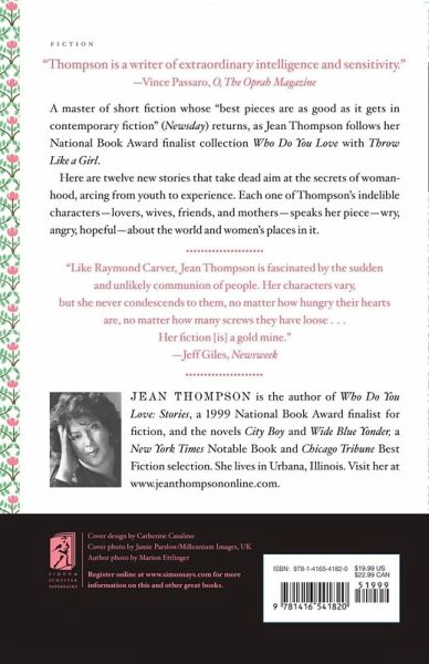 A New York Times Notable Book San Francisco Chronical Best Book of the Year A master of short fiction whose "best pieces are as good as it gets in contemporary fiction" (Newsday) returns, as Jean Thompson follows her National Book Award finalist collection Who Do You Love with Throw Like a Girl. Here are twelve new stories that take dead aim at the secrets of womanhood, arcing from youth to experience. Each one of Thompson's indelible characters—lovers, wives, friends, and mothers—speaks her piece—wry, angry, hopeful—about the world and women's places in it. This collection includes the following short stories: “The Brat” “The Five Senses” “It Would Not Make Me Tremble to See Ten Thousand Fall” “The Family Barcus” “Lost” “The Inside Passage” “Holy Week” “A Normal Life” “Hunger” “The Woman Taken in Adultery” “Pie of the Month” “Throw Like a Girl”