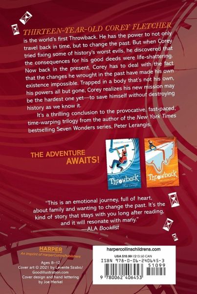 Peter Lerangis, the New York Times bestselling author of the Seven Wonders and Max Tilt series, returns with the last installment of his electrifying trilogy about a boy who discovers that he can alter the course of history. Thirteen-year-old Corey Fletcher is the world's first Throwback. He has the power to not only to travel back in time, but to change the past. It's a power that comes with no small amount of responsibility?but when Corey tried fix some of history's worst evils, he discovers that the consequences for his good deeds have changed him in ways that he never expected and ways he may not be able to fix. Trapped in a body that's not his own, his powers all but gone, Corey realizes his latest mission may be the hardest of all?to save himself. With the help of his best friend, Leila, and an uneasy alliance with a shadowy group that's been watching his every move, Corey's going to have to risk it all to find a way to fix himself without destroying the world as we know it. Get ready for time-warping adventure with a historical twist in the last book of the Throwback trilogy from New York Times bestselling author Peter Lerangis, whose books have sold over five and a half million copies worldwide.