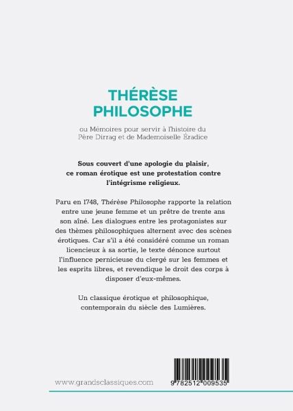 Sous couvert d'une apologie du plaisir, ce roman érotique est une protestation contre l'intégrisme religieux. POUR UN PUBLIC AVERTI. Paru en 1748, Thérèse Philosophe rapporte la relation entre une jeune femme et un prêtre de trente ans son aîné. Les dialogues entre les protagonistes sur des thèmes philosophiques alternent avec des scènes érotiques. Car s'il a été considéré comme un roman licencieux à sa sortie, le texte dénonce surtout l'influence pernicieuse du clergé sur les femmes et les esprits libres, et revendique le droit des corps à disposer d'eux-mêmes. Un classique érotique et philosophique, contemporain du siècle des Lumières. EXTRAIT Que de combats, mon cher comte, il m¿a fallu rendre jusqüà l¿âge de vingt-trois ans, temps auquel ma mère me retira de ce maudit couvent ! J¿en avais à peine seize lorsque je tombai dans un état de langueur qui était le fuit de mes méditations. Elles m¿avaient fait apercevoir sensiblement deux passions en moi, qüil m¿était impossible de concilier : d¿un côté j¿aimais Dieu de bonne foi, je désirais de tout mon c¿ur le servir de la manière dont on m¿assurait qüil voulait être servi, d¿un autre côté je sentais les désirs violents dont je ne pouvais démêler le but. Ce serpent chiant se peignit sans cesse dans mon âme et s¿y arrêtait malgré moi, soit en veillant, soit en dormant. Quelquefois, tout émue, je croyais y porter la main, je le caressais, j¿admirais son air noble, altier, sa fermeté, quoique j¿en ignorasse encore l¿usage. Mon c¿ur battait avec une vitesse étonnante et, dans le fort de mon extase ou de mon rêve, toujours marqué par un frémissement de volupté, je ne me connaissais presque plus : ma main se trouvait saisie de la pomme, mon doigt remplaçait le serpent. Excitée par les avant-coureurs du plaisir, j¿étais incapable d¿aucune autre réflexion : l¿enfer entrouvert sous mes yeux n¿aurait pas eu le pouvoir de m¿arrêter. Remords impuissants, je mettais le comble à la volupté ! À PROPOS DE L'AUTEUR Jean-Baptiste de Boyer ou le Marquis d'Argens (1704-1771) est un écrivain français inspiré par la philosophie des sceptiques. Il mène une jeunesse licencieuse en compagnie des actrices de théâtre et, à 15 ans, il décide de suivre une carrière militaire malgré l'opposition de son père, qui le déshérite. Lorsqu'il atteint la quarantaine, Boyer d'Argens est remarqué par Frédéric II de Prusse qui le fait venir à sa cour en tant que directeur général de son Académie des sciences. À PROPOS DE LA COLLECTION Retrouvez les plus grands noms de la littérature érotique dans notre collection Grands classiques érotiques. Autrefois poussés à la clandestinité et relégués dans « l'Enfer des bibliothèques », les auteurs de ces ¿uvres incontournables du genre sont aujourd'hui reconnus mondialement. Du Marquis de Sade à Alphonse Momas et ses multiples pseudonymes, en passant par le lyrique Alfred de Musset ou la féministe Renée Dunan, les Grands classiques érotiques proposent un catalogue complet et varié qui contentera tant les novices que les connaisseurs.