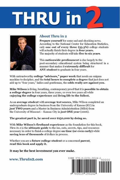 Thru In 2 is the ultimate guide to the ins, outs, secrets, tips, and resources necessary to finish a college degree on time (or even early) and saving tens of thousands of dollars in process. As an average student with average test scores, Mike Wilson (the author) completed his undergraduate degree in just TWO years from the University of Kansas (KU) as well as his Master in Business Administration (MBA) from the University of Missouri - Kansas City in just ONE year (2006). With Mike Wilson's firsthand experience as the foundation for this book, Thru In 2 is a quick and easy read that aims to provide future students with the information necessary to maximize their college career. Whether you are a future college student or a concerned parent, read this book and apply it's contents. It may be the best investment you ever make.