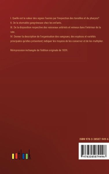 Réimpression inchangée de l'édition originale de 1839. I. Quelle est la valeur des signes fournis par l'inspection des tonsilles et du pharynx? II. De la stomatite gangréneuse chez les enfants. III. De la disposition respective des vaisseaux artériels et veineux dans l'intérieur de la rate. IV. Donner la description de l'organisation des sangsues; des espèces et variétés principales qu'elles présentent; indiquer les moyens de les conserver et de les multiplier.
