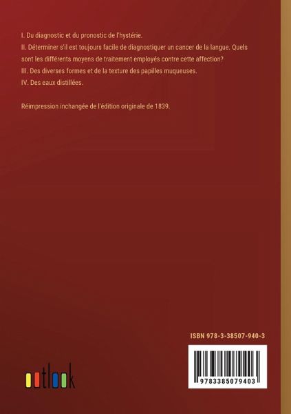 Réimpression inchangée de l'édition originale de 1839. I. Du diagnostic et du pronostic de l'hystérie. II. Déterminer s'il est toujours facile de diagnostiquer un cancer de la langue. Quels sont les différents moyens de traitement employés contre cette affection? III. Des diverses formes et de la texture des papilles muqueuses. IV. Des eaux distillées.