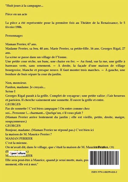 "Huit jours à la campagne... Pièce en un acte La pièce a été représentée pour la première fois au Théâtre de la Renaissance, le 5 février 1906. Personnages Maman Perrier, 67 ans. Madame Perrier, sa bru. 40 ans. Marie Perrier, sa petitefille. 16 ans. Georges Rigal, 27 ans. La scène se passe dans un village de l¿Yonne. Une petite cour sèche, un banc, une chaise en fer. ¿ Au fond, sur la rue, une grille à barreaux verts, sans ornement. ¿ À droite, la façade d¿une maison de village bourgeoise, blanche et presque neuve. Il faut monter trois marches. ¿ À gauche, une bordure de buis sépare la cour du jardin. Non, monsieur. Pardon, madame. Je croyais... Scène I Georges Rigal paraît à la grille. Complet de voyageur ; une petite valise ; l¿air heureux et parisien. Il cherche vainement une sonnette. Il ouvre la grille et entre. GEORGES Pas de sonnette ! C¿est bien campagne ! On entre comme chez soi... Personne !... charmant... Quelqüun, s¿il vous plaît ? (Maman Perrier arrive lentement du jardin ; elle est vieille, petite, droite, maigre, soupçonneuse.) GEORGES Bonjour, madame. (Maman Perrier ne répond pas.) C¿est bien ici la maison de M. Maurice Perrier ? MAMAN PERRIER C¿est la mienne. On m¿avait dit, dans le village, que c¿était la maison de M. Maurice Perrier. (Il va s¿éloigner.) MAMAN PERRIER Elle sera peutêtre à Maurice, quand je serai morte, mais, pour le moment, elle est à moi."