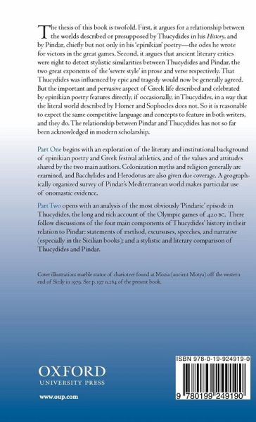 Simon Hornblower argues for a relationship between Thucydides and Pindar not so far acknowledged in modern scholarship. He argues that ancient critics were right to detect stylistic similarities between these two great exponents of the "severe style" in prose and verse. In Part One he explores the background of epinikian poetry and athletics, the values shared by the two authors, and religion and colonization myths, and presents a geographically organized survey of Pindar's Mediterranean world, exploiting onomastic evidence. Part Two includes an analysis of Thucydides' account of the Olympic games of 420 BC; discussions of the four components of Thucydides' history in their relation to Pindar; statements of method, excursuses, speeches, and narrative, especially the Sicilian books; and a stylistic-literary comparison of Thucydides and Pindar.